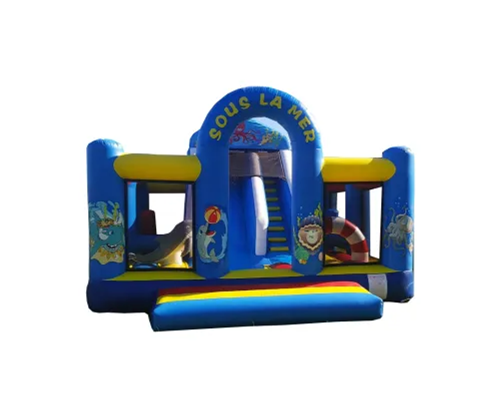 Matelas gonflable sur le thème de la mer, à l’intérieur on trouve des obstacles marins et un grand toboggan.